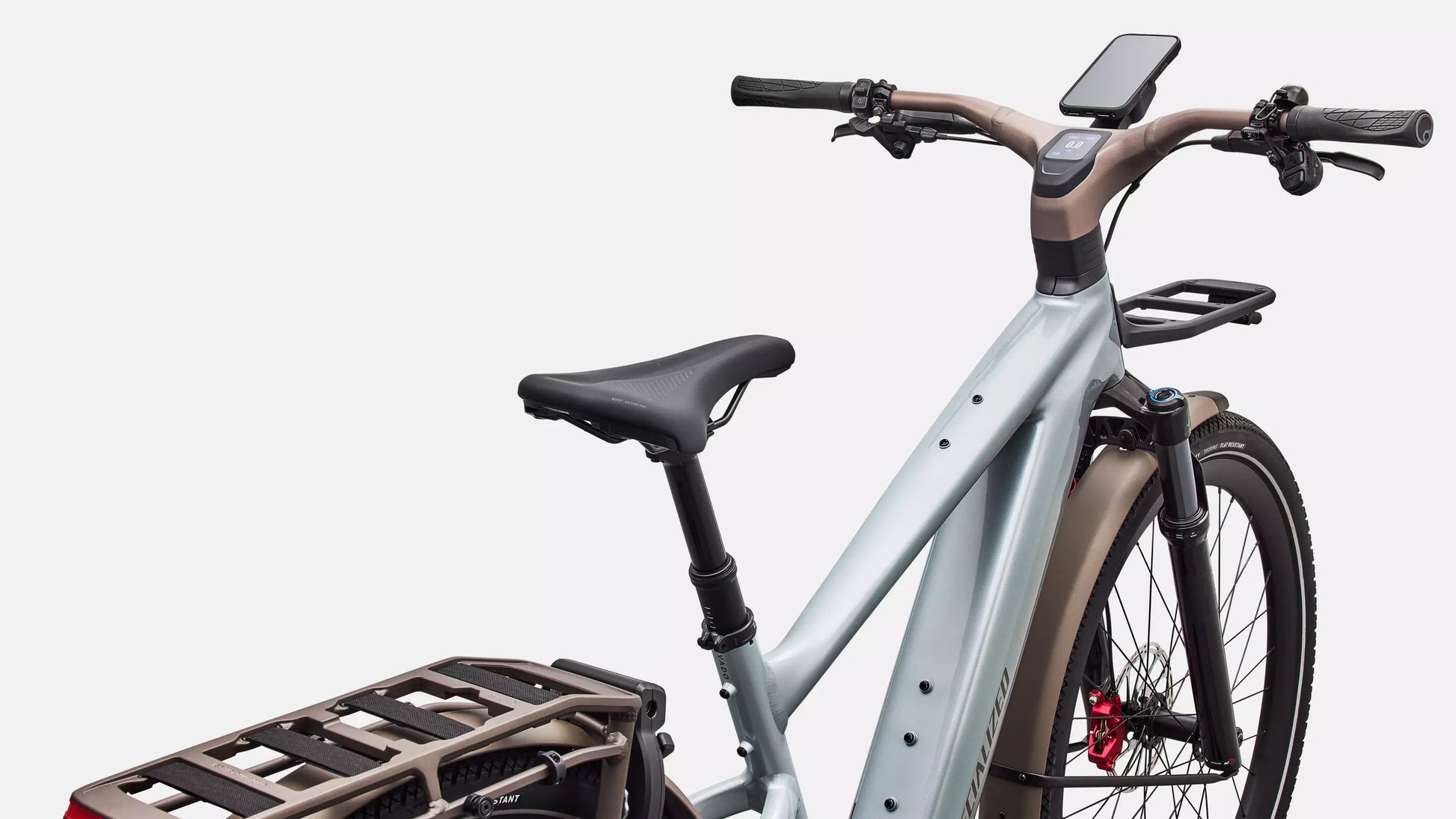 Vado 3 sukurtas maksimaliai pasitikėti stabdant ir pradedant važiuoti. Vieno mygtuko paspaudimu nuleisite 40 mm pakabinamą sėdynę, kad kojomis galėtumėte stabiliai remtis į žemę sėdint, taip palengvinant sustojimus. Kai pradėsite pedalinti ir Specialized 3.1 variklis pasieks kelionės greitį, paspauskite mygtuką, kad pakeltumėte sėdynę efektyviausiai ir pasitikėjimo kupinai važiavimo pozicijai – kartu mėgaukitės papildomu komfortu dėl sėdynės stulpo integruotos pakabos.