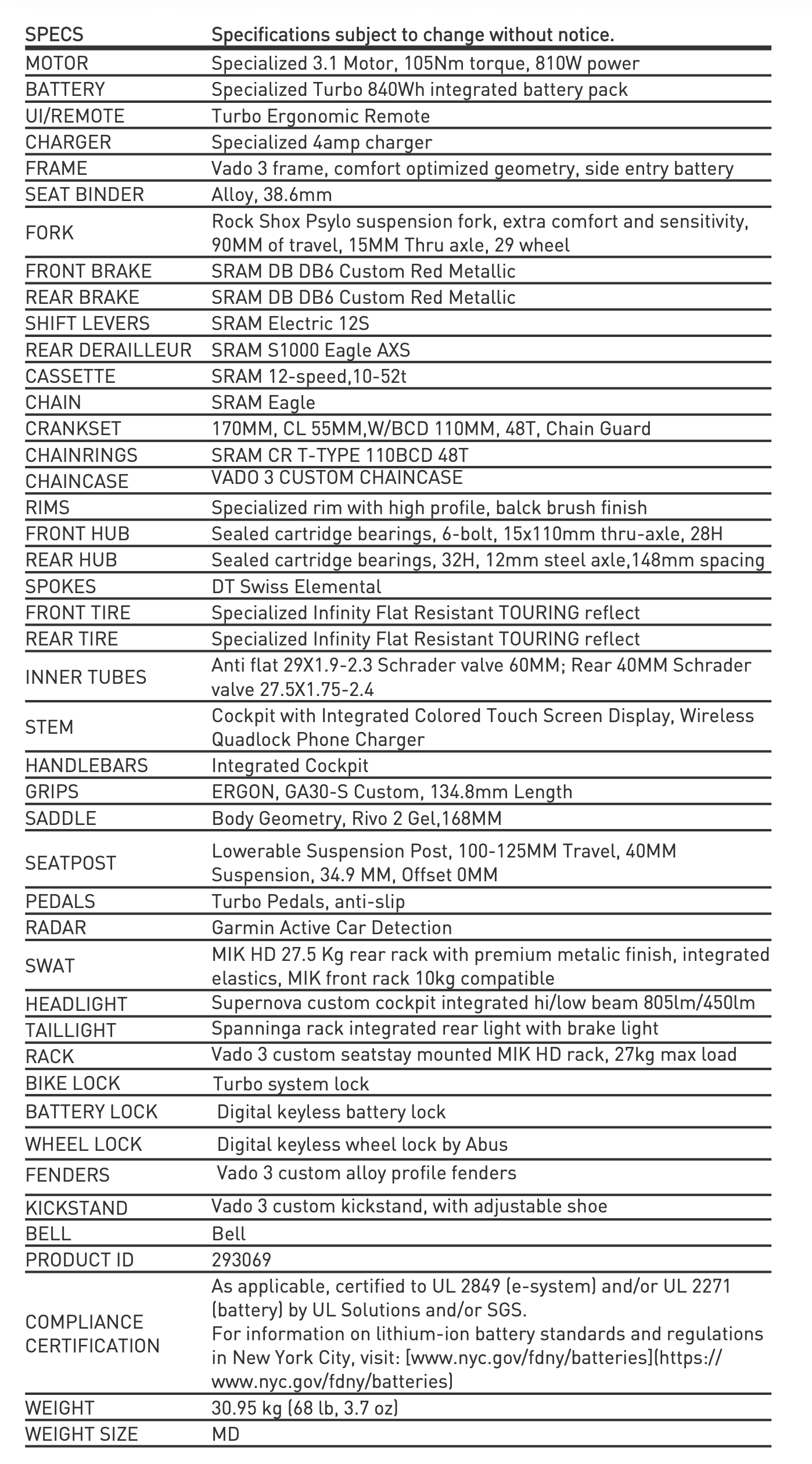 E-dviračio sistema: Specialized 3.1 variklis su 810 W ir 105 Nm, 840 Wh baterija, iki 150 km nuvažiuojamas atstumas